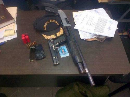 calibre 12, con cuatro cartuchos, un chaleco antibalas, una gorra del