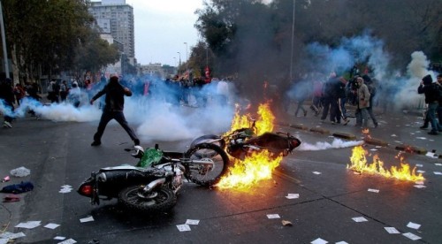 En los incidentes, los manifestantes incendiaron también un automóvil y trataron de atacar una comisaría de Carabineros.